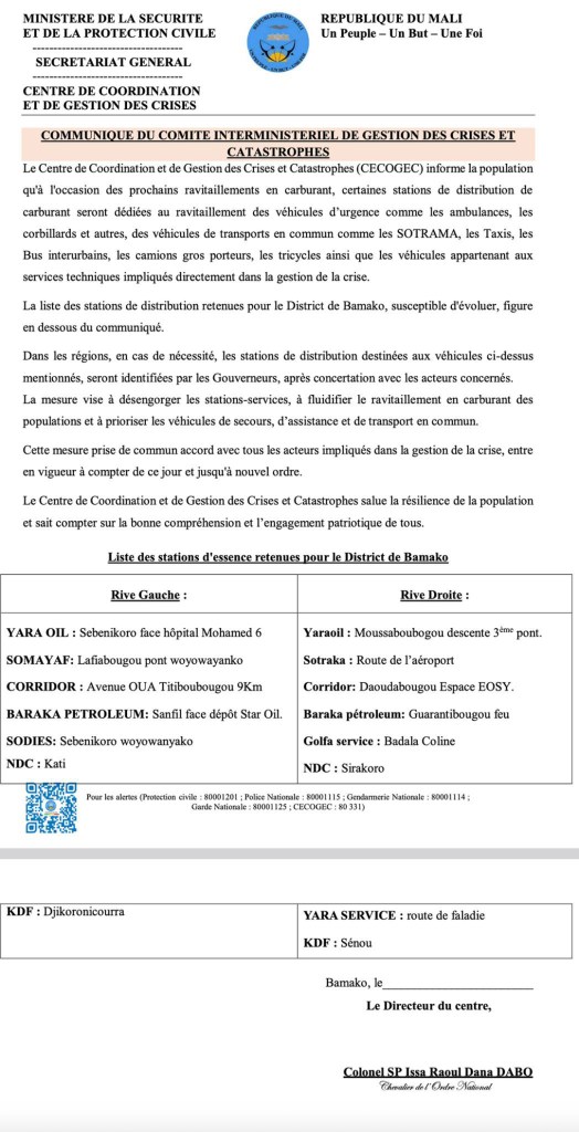 Le communiquĂ© signĂ© par le Colonel SP Issa Raoul Dana DABO, Directeur du CECOGEC, prĂ©cise que cette mesure vise Ă fluidifier le ravitaillement en carburant et Ă prioriser les vĂ©hicules dâurgence, dâassistance et de transport public. Elle est effective dĂšs sa publication et restera en vigueur jusquâĂ nouvel ordre.
